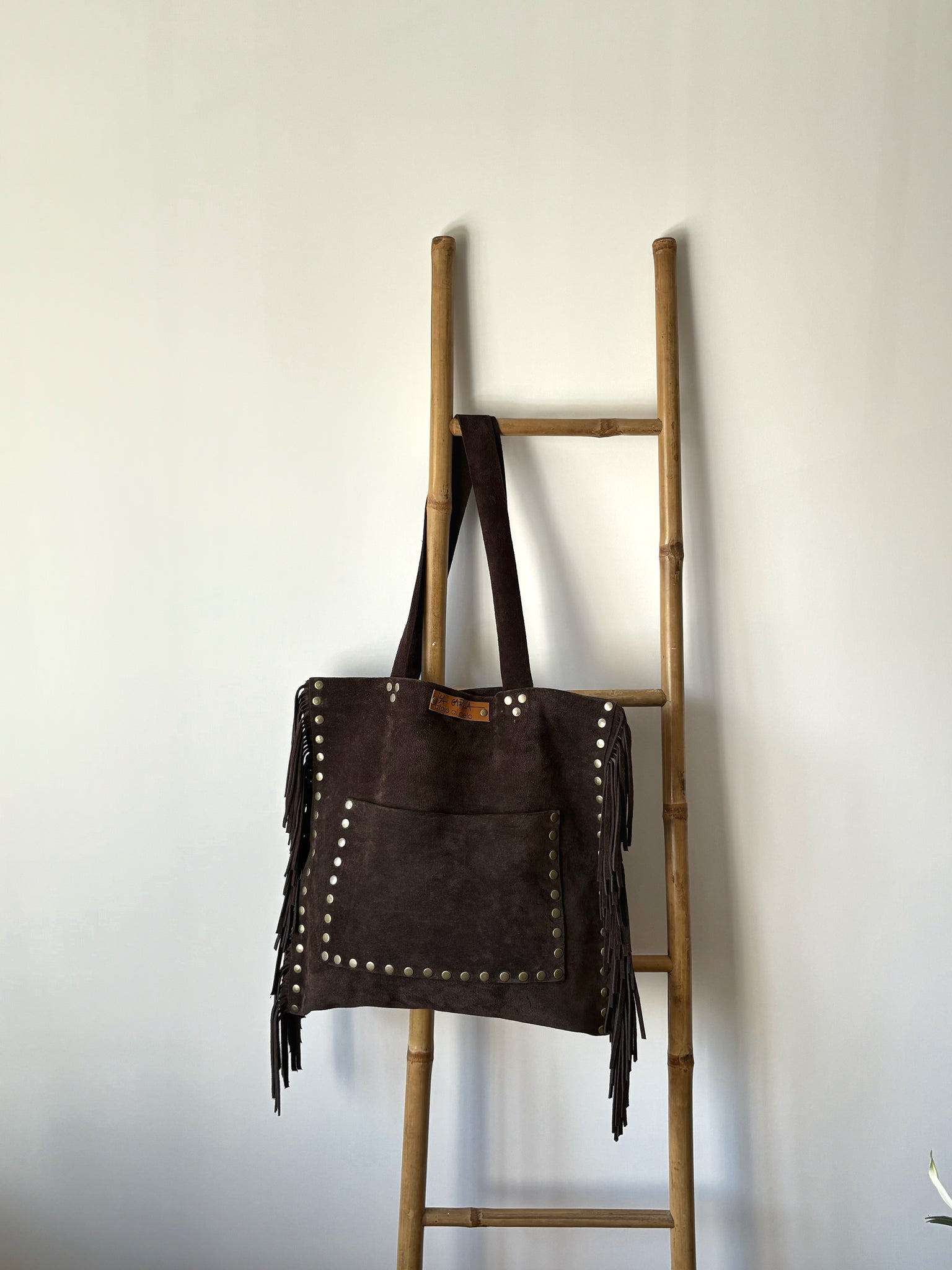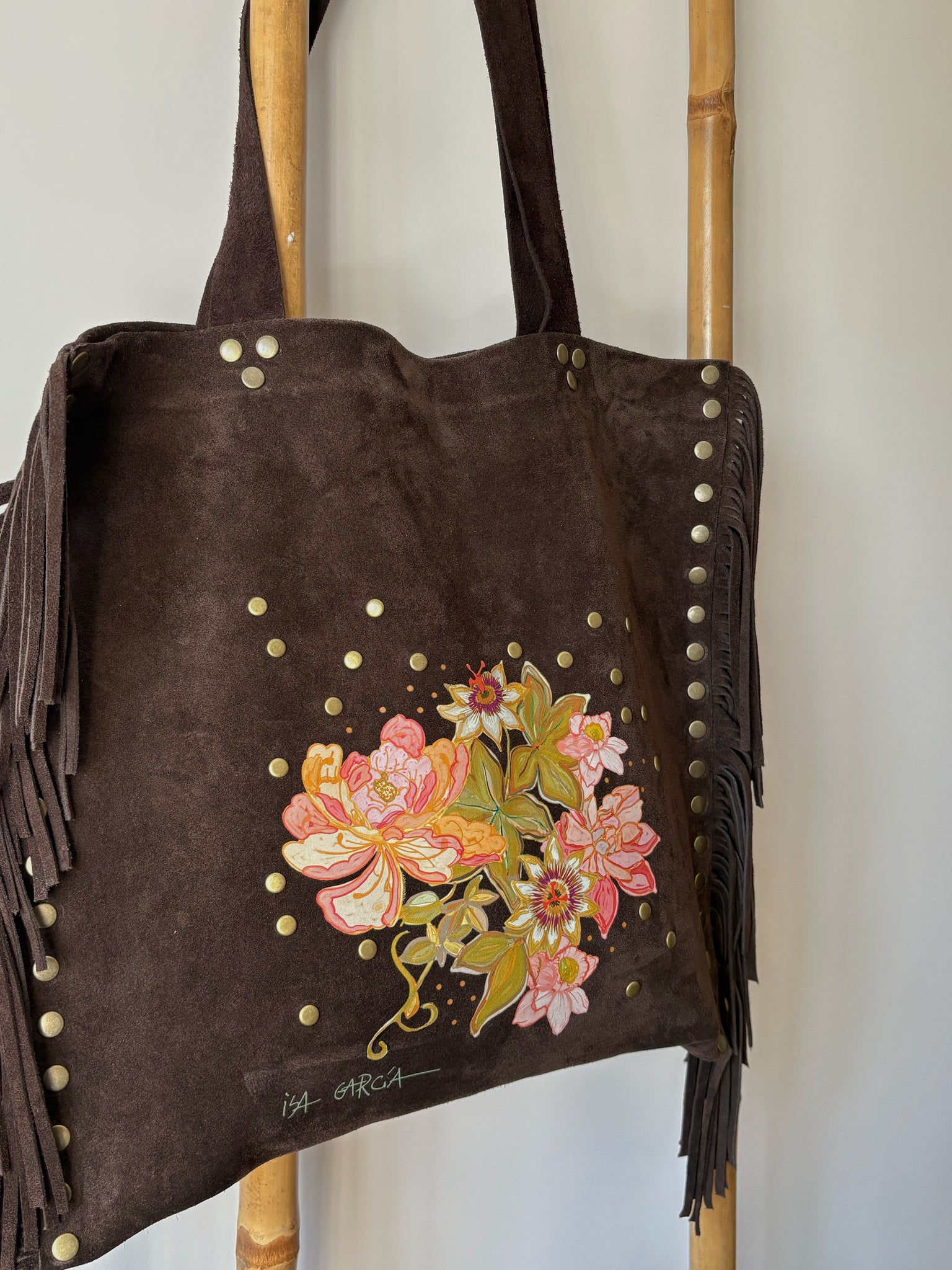 Cartera de cuero marrón flores